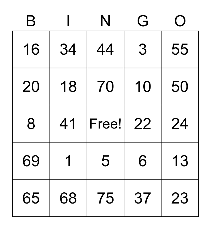 This bingo card has a free space and 25 words: 1, 75, 70, 65, 55, 16, 20, 34, 22, 5, 10, 8, 6, 13, 18, 66, 24, 44, 50, 41, 23, 68, 69, 3 and 37.