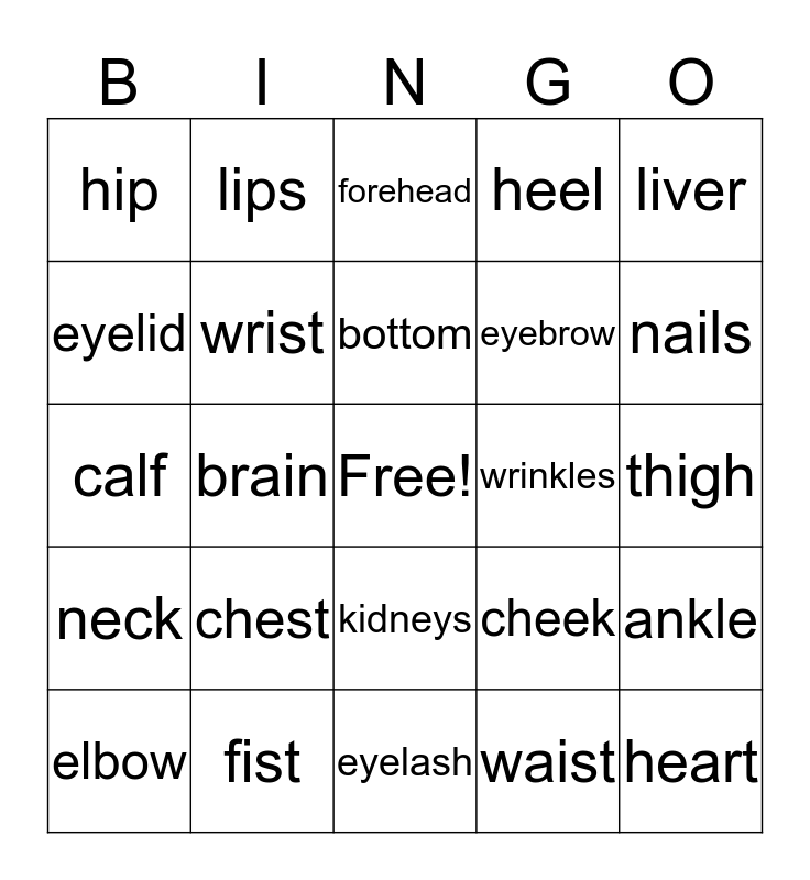 This bingo card has a free space and 27 words: cheek, chin, eyebrow, eyelash, eyelid, forehead, lips, neck, wrinkles, ankle, calf, heel, elbow, fist, nails, palm, wrist, bottom, chest, hip, thigh, waist, brain, heart, kidneys, liver and lungs.