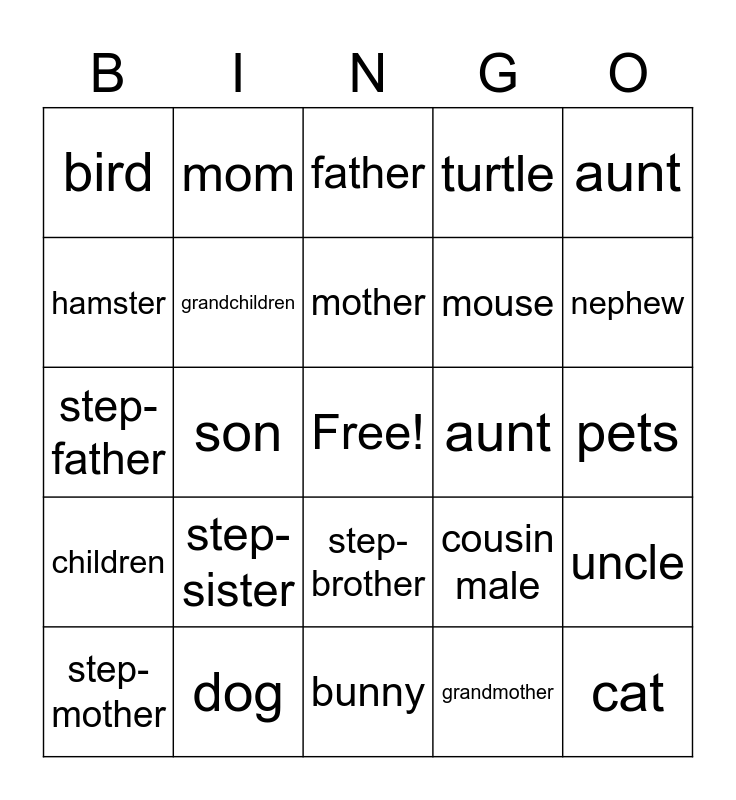 This bingo card has a free space and 32 words: grandmother, grandfather, son, daughter, children, grandchildren, aunt, uncle, mom, dad, mother, father, brother, sister, aunt, uncle, step-mother, step-father, step-brother, step-sister, cousin male, cousin female, pets, dog, cat, turtle, mouse, hamster, bird, bunny, niece and nephew.