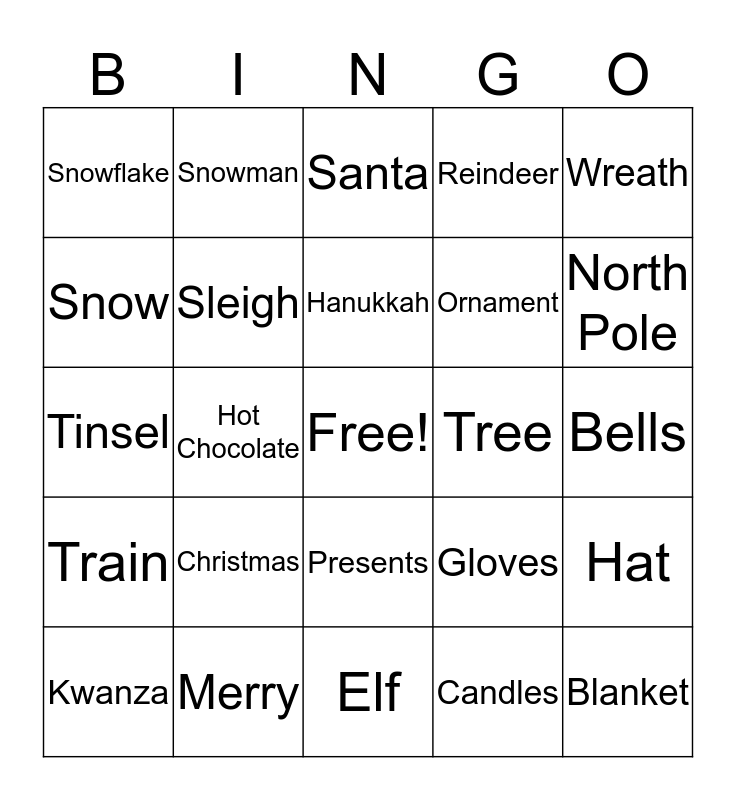 This bingo card has a free space and 24 words: Christmas, Merry, Hanukkah, Kwanza, Wreath, Snowflake, Snow, Snowman, Tree, Presents, Ornament, Tinsel, Gloves, Hat, Sleigh, Candles, Bells, Santa, North Pole, Hot Chocolate, Blanket, Train, Reindeer and Elf.