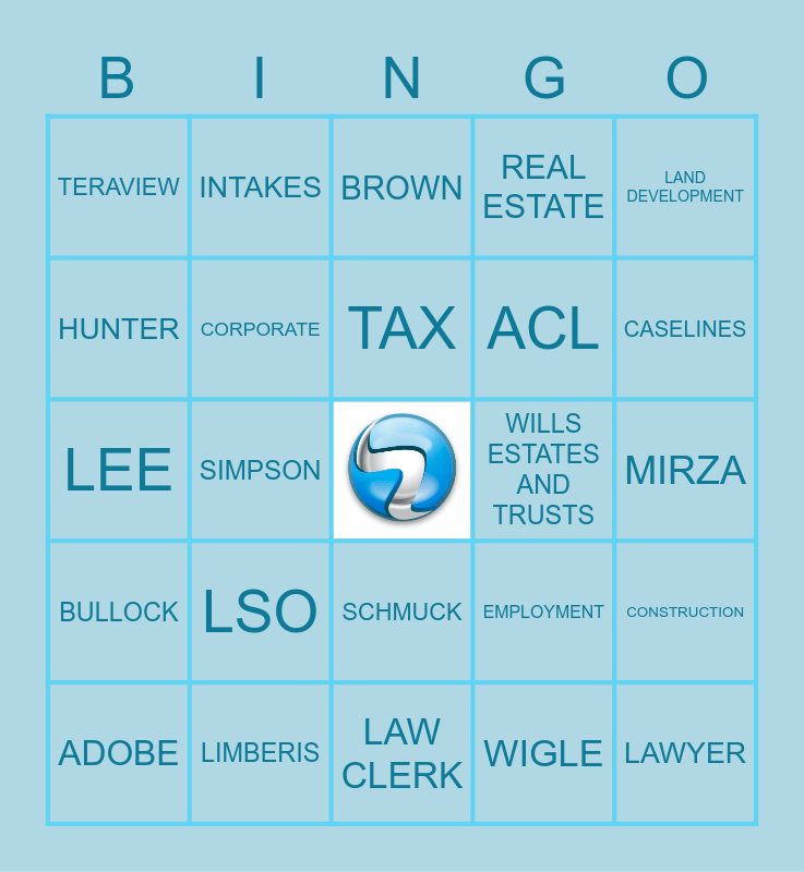 This bingo card has a free space and 47 words: LAW, LAWYER, LEGAL ASSISTANT, LAW CLERK, LSO, ARTICLING, INTAKES, GHOSTPRACTICE, HUNTER, SKYVIEW, CORPORATE, REAL ESTATE, CONSTRUCTION, EMPLOYMENT, IMMIGRATION, INSOLVENCY, TAX, WILLS ESTATES AND TRUSTS, CONDOMINIUM, LAND DEVELOPMENT, SIMPSON, WIGLE, TERAVIEW, ACL, UNITY, CASELINES, ADOBE, MICROSOFT, SCHMUCK, BULLOCK, FISHER, OSBORNE, DURDAN, FOREMAN, HAMDANI, LIMBERIS, MIRZA, MONACO, NEIL, OLSIAK, RAMACIERI, BROWN, LEE, NALSOK, ROSENBLATT, SARSH and SAVAS.