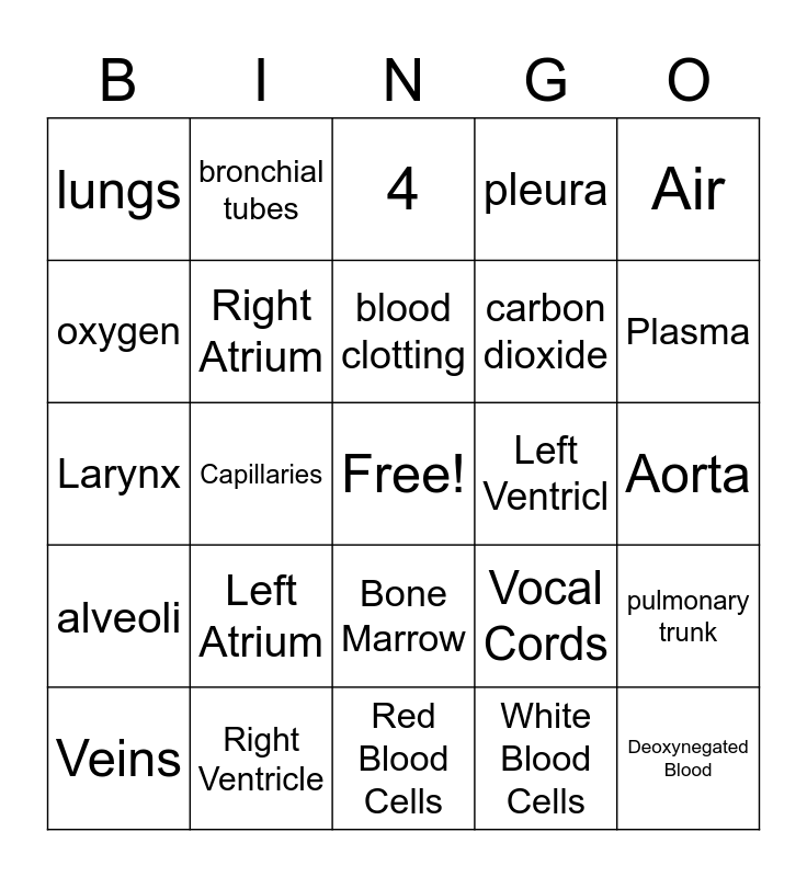 This bingo card has a free space and 29 words: Veins, Arteries, Capillaries, platelets, lungs, 4, Right Atrium, Left Atrium, Left Ventricl, Right Ventricle, Aorta, Deoxynegated Blood, Red Blood Cells, White Blood Cells, Plasma, hemoglobin, Bone Marrow, alveoli, Air, Larynx, Vocal Cords, diaphragm, carbon dioxide, oxygen, pleura, bronchial tubes, pulmonary trunk, blood clotting and Balaenoptera musculus.