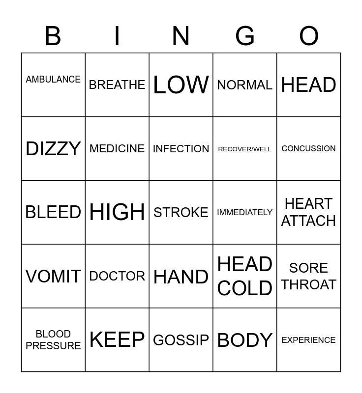 This bingo card has a free space and 29 words: BLOOD PRESSURE, EXAMINE, HIGH, COVER, AMBULANCE, LOW, MEDICINE, DOCTOR, IMMEDIATELY, KEEP, HEART ATTACH, EXPERIENCE, GOSSIP, BODY, CONCUSSION, PAIN, HAND, VOMIT, HEAD, BLEED, HEAD COLD, COUGH, RECOVER/WELL, DIZZY, NORMAL, BREATHE, SORE THROAT, INFECTION and SPILL.