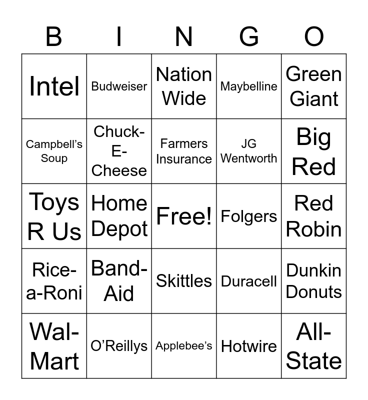 This bingo card has a free space and 52 words: Alka Seltzer, All-State, Almond Joy, Applebee’s, Band-Aid, Bounty, Budweiser, Burger King, Campbell’s Soup, Capital One, Chuck-E-Cheese, Coca-Cola, Dunkin Donuts, Duracell, Education Connection, Empire Today, Farmers Insurance, Folgers, Free Credit Report.com, Green Giant, Home Depot, Hotwire, Intel, JG Wentworth, Kay Jeweler, Kit Kat, Klondike, Libby’s, Big Red, Liberty Mutual, Lucky Charms, Maybelline, McDonalds, Meow Mix Catfood, Mr. Clean, Nation Wide, O’Reillys, Pepto-Bismal, Play Station, Pull-Ups, Red Bull, Red Robin, Rice-a-Roni, Ricola, Skittles, Stanley Steamer, Subway, Toys R Us, Trix, Tums, Wal-Mart and Wendy’s.