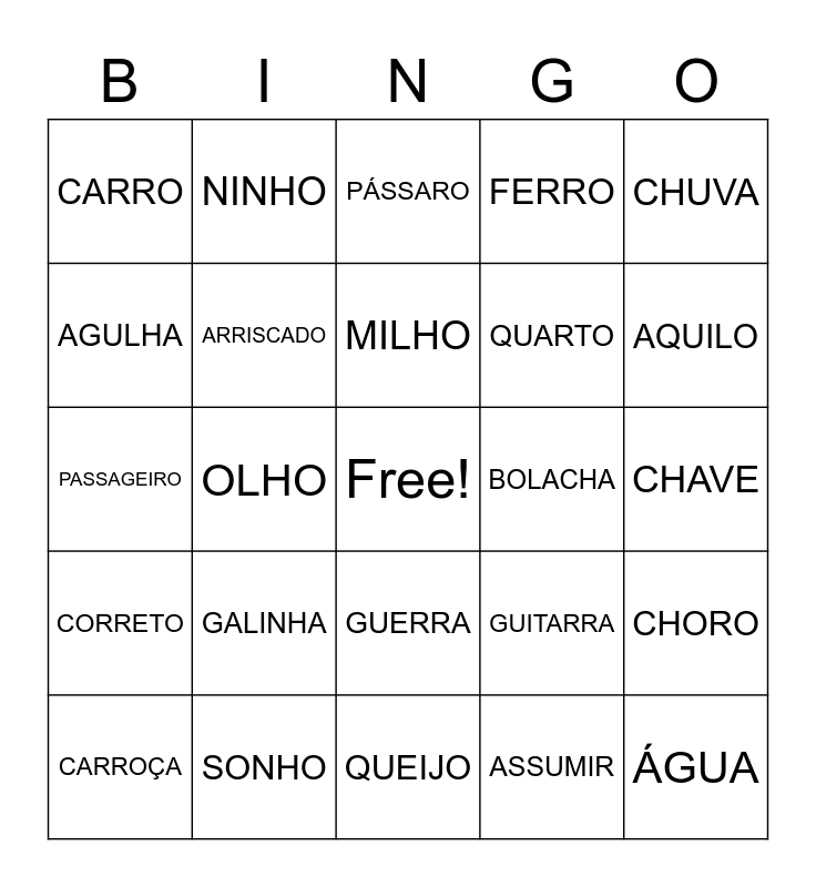 This bingo card has a free space and 27 words: GUITARRA, FOGUEIRA, QUARTO, QUEIJO, AGULHA, PÁSSARO, NINHO, CORRETO, BOLACHA, CHORO, PASSAGEIRO, FERRO, CARROÇA, SONHO, AQUILO, PALHAÇO, ARRISCADO, MILHO, GALINHA, CARRO, CHAVE, ASSUMIR, OLHO, ÁGUA, GUERRA, CHUVA and SENHA.