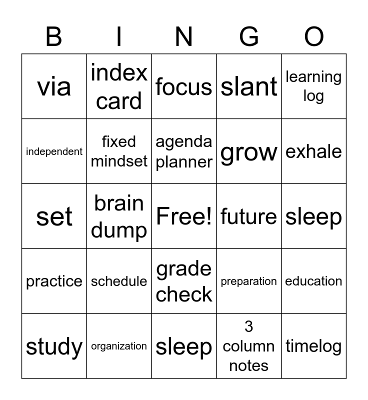 This bingo card has a free space and 24 words: schedule, organization, agenda planner, study, learning log, via, independent, index card, future, grade check, grow, set, preparation, education, fixed mindset, 3 column notes, sleep, focus, exhale, brain dump, timelog, practice, slant and sleep.