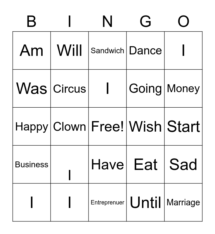 This bingo card has a free space and 24 words: I, I, I, I, I, Am, Was, Will, Wish, Have, Going, Happy, Eat, Sad, Circus, Until, Start, Sandwich, Money, Clown, Marriage, Business, Dance and Entreprenuer.