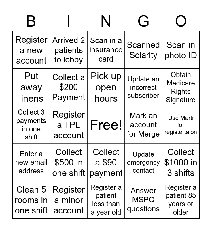 This bingo card has a free space and 29 words: Clean 5 rooms in one shift, Complete a self pay registration, Register a TPL account, Register a BWC account, Register a new account, Scan in a insurance card, Collect a $200 Payment, Collect $500 in one shift, Mark an account for Merge, Register a minor account, Use Marti for registertaion, Register a patient 85 years or older, Register a patient less than a year old, Answer MSPQ questions, Obtain Medicare Rights Signature, Update incorrect patient name, Collect a $90 payment, Enter a new email address, Scan in photo ID, Collect 3 payments in one shift, Update emergency contact, Collect one past balance, Update an incorrect subscriber, Put away linens, Scanned Solarity, Arrived 2 patients to lobby, Collect $1000 in 3 shifts, Pick up open hours and Fill out Gemba board.