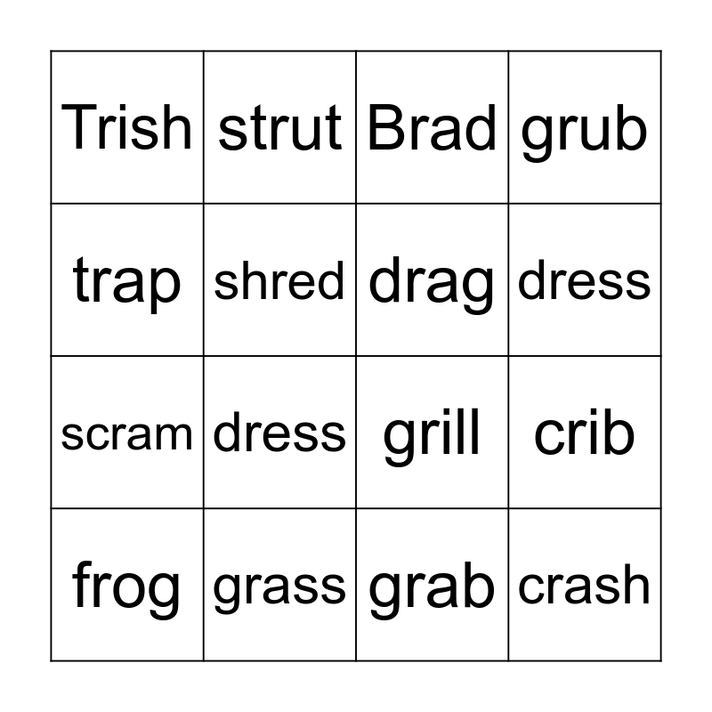 This bingo card has 20 words: crib, prom, Brad, drum, frog, trap, grass, Trish, scram, strut, dress, grill, shred, crash, drag, drop, dress, grub, grab and trip.