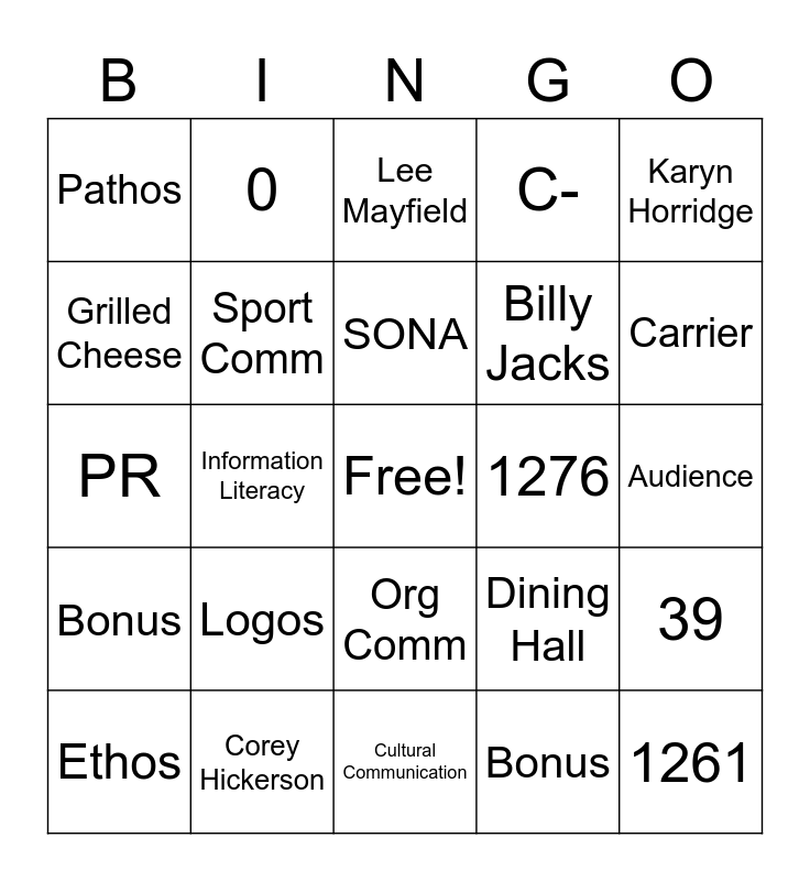 This bingo card has a free space and 29 words: Ethos, Signs and Symbols, Information Literacy, Robert Aguirre, Pathos, Lee Mayfield, Sport Comm, Logos, 1276, Corey Hickerson, Audience, 1261, Cultural Communication, Bonus, Carrier, Rose, Org Comm, Bonus, Karyn Horridge, PR, Dining Hall, President's home, Billy Jacks, Grilled Cheese, C-, 0, 39, SONA and Kline's.