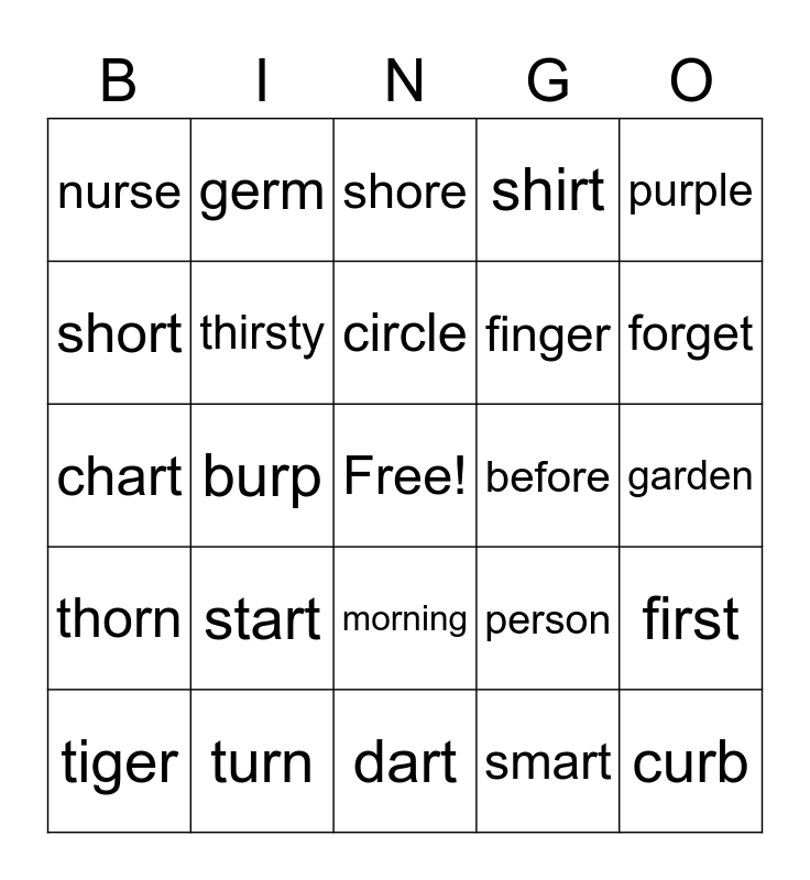 This bingo card has a free space and 24 words: start, turn, circle, tiger, purple, nurse, short, germ, before, morning, finger, chart, person, first, thirsty, smart, garden, shore, forget, burp, curb, thorn, shirt and dart.