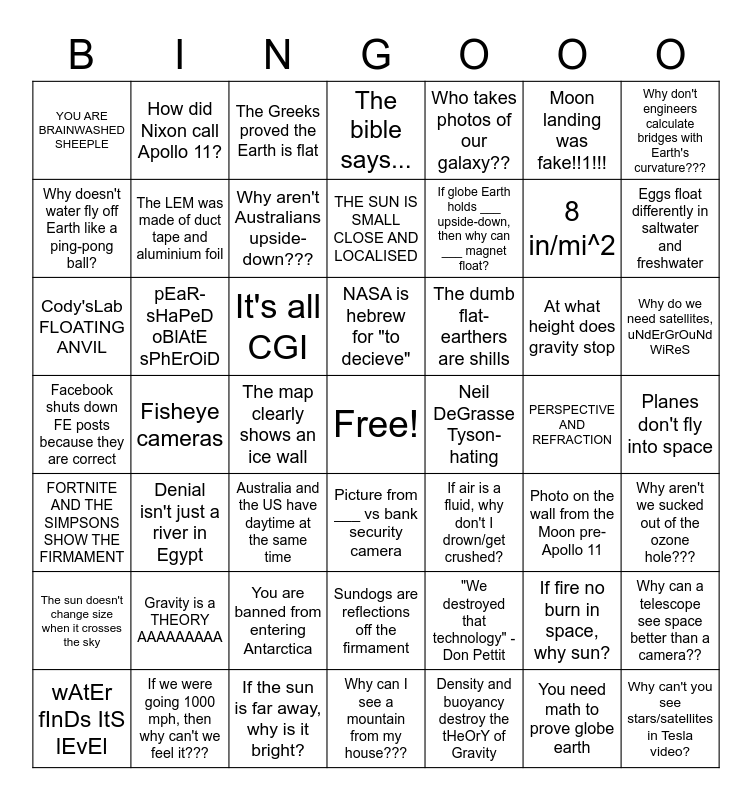 This bingo card has a free space and 48 words: "We destroyed that technology" - Don Pettit, 8 in/mi^2, Why can I see a mountain from my house???, Fisheye cameras, It's all CGI, Planes don't fly into space, How did Nixon call Apollo 11?, If we were going 1000 mph, then why can't we feel it???, Moon landing was fake!!1!!!, Picture from ___ vs bank security camera, Why don't engineers calculate bridges with Earth's curvature???, The bible says..., At what height does gravity stop, The dumb flat-earthers are shills, The sun doesn't change size when it crosses the sky, PERSPECTIVE AND REFRACTION, Why doesn't water fly off Earth like a ping-pong ball?, Eggs float differently in saltwater and freshwater, If fire no burn in space, why sun?, Who takes photos of our galaxy??, If globe Earth holds ___ upside-down, then why can ___ magnet float?, The map clearly shows an ice wall, YOU ARE BRAINWASHED SHEEPLE, The LEM was made of duct tape and aluminium foil, Why can a telescope see space better than a camera??, Why aren't Australians upside-down???, Why do we need satellites, uNdErGrOuNd WiReS, wAtEr fInDs ItS lEvEl, NASA is hebrew for "to decieve", pEaR-sHaPeD oBlAtE sPhErOiD, You need math to prove globe earth, Neil DeGrasse Tyson-hating, Why aren't we sucked out of the ozone hole???, Gravity is a THEORY AAAAAAAAA, Facebook shuts down FE posts because they are correct, If air is a fluid, why don't I drown/get crushed?, Photo on the wall from the Moon pre-Apollo 11, Cody'sLab FLOATING ANVIL, Australia and the US have daytime at the same time, You are banned from entering Antarctica, FORTNITE AND THE SIMPSONS SHOW THE FIRMAMENT, Why can't you see stars/satellites in Tesla video?, The Greeks proved the Earth is flat, If the sun is far away, why is it bright?, THE SUN IS SMALL CLOSE AND LOCALISED, Sundogs are reflections off the firmament, Denial isn't just a river in Egypt and Density and buoyancy destroy the tHeOrY of Gravity.