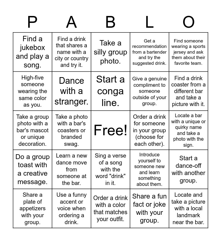 This bingo card has a free space and 35 words: Order a drink with an umbrella., Take a selfie with a bartender., Find a neon bar sign and take a picture with it., Dance with a stranger., Sing a verse of a song with the word "drink" in it., Get a recommendation from a bartender and try the suggested drink., High-five someone wearing the same color as you., Exchange names with someone at the bar and remember it., Start a conga line., Have a bartender or fellow bar patron teach you how to make a simple cocktail., Take a group photo with a bar's mascot or unique decoration., Find someone wearing a sports jersey and ask them about their favorite team., Order a non-alcoholic drink., Play a round of pool or darts., Find a jukebox and play a song., Order a drink for someone in your group (choose for each other)., Share a fun fact or joke with your group., Take a photo with a bar's coasters or branded swag., Do a group toast with a creative message., Locate and take a picture with a local landmark near the bar., Introduce yourself to someone new and learn something about them., Share a plate of appetizers with your group., Start a dance-off with another group., Use a funny accent or voice when ordering a drink., Take a silly group photo., Find a drink coaster from a different bar and take a picture with it., Order a drink named after a famous person or fictional character., Successfully complete a bar's drink special or promotion., Give a genuine compliment to someone outside of your group., Locate a bar with a unique or quirky name and take a photo with the sign., Start a mini rock-paper-scissors tournament with your group or other patrons., Order a drink with a color that matches your outfit., Learn a new dance move from someone at the bar., Find a drink that shares a name with a city or country and try it. and Take a photo recreating a famous movie or TV scene with your group..
