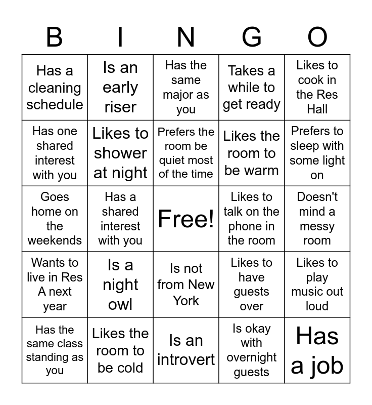 This bingo card has a free space and 24 words: Is a night owl, Likes the room to be cold, Prefers the room be quiet most of the time, Has the same class standing as you, Likes to cook in the Res Hall, Has a cleaning schedule, Has one shared interest with you, Is an early riser, Likes to talk on the phone in the room, Is not from New York, Likes the room to be warm, Goes home on the weekends, Likes to have guests over, Likes to play music out loud, Likes to shower at night, Is okay with overnight guests, Doesn't mind a messy room, Has the same major as you, Prefers to sleep with some light on, Has a shared interest with you, Has a job, Wants to live in Res A next year, Takes a while to get ready and Is an introvert.