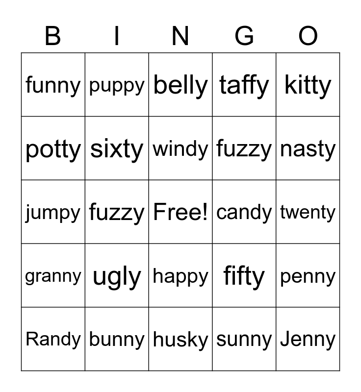 This bingo card has a free space and 24 words: ugly, bunny, windy, Randy, kitty, funny, potty, puppy, candy, happy, fuzzy, jumpy, fifty, penny, sixty, sunny, twenty, belly, nasty, fuzzy, Jenny, granny, taffy and husky.