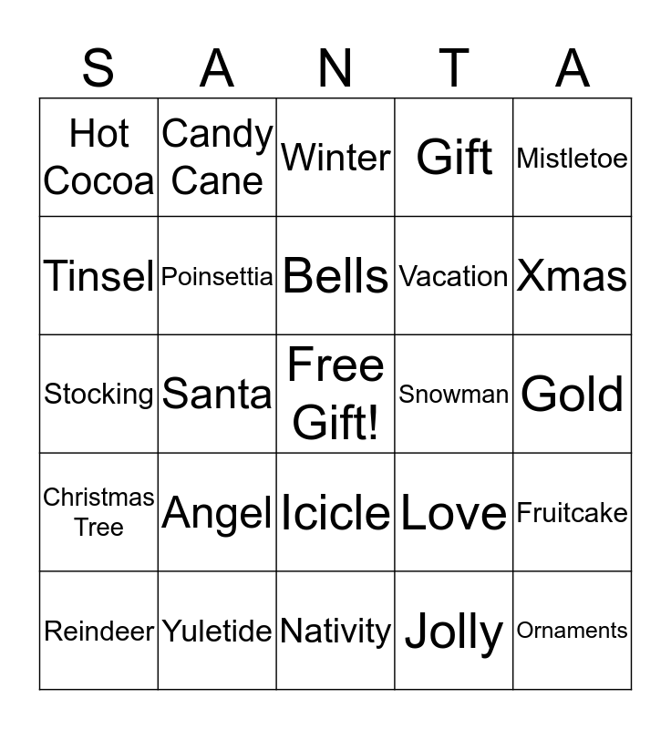 This bingo card has a free space and 24 words: Angel, Yuletide, Bells, Reindeer, Mistletoe, Hot Cocoa, Tinsel, Candy Cane, Snowman, Icicle, Vacation, Stocking, Love, Fruitcake, Poinsettia, Jolly, Gold, Winter, Xmas, Santa, Ornaments, Christmas Tree, Gift and Nativity.