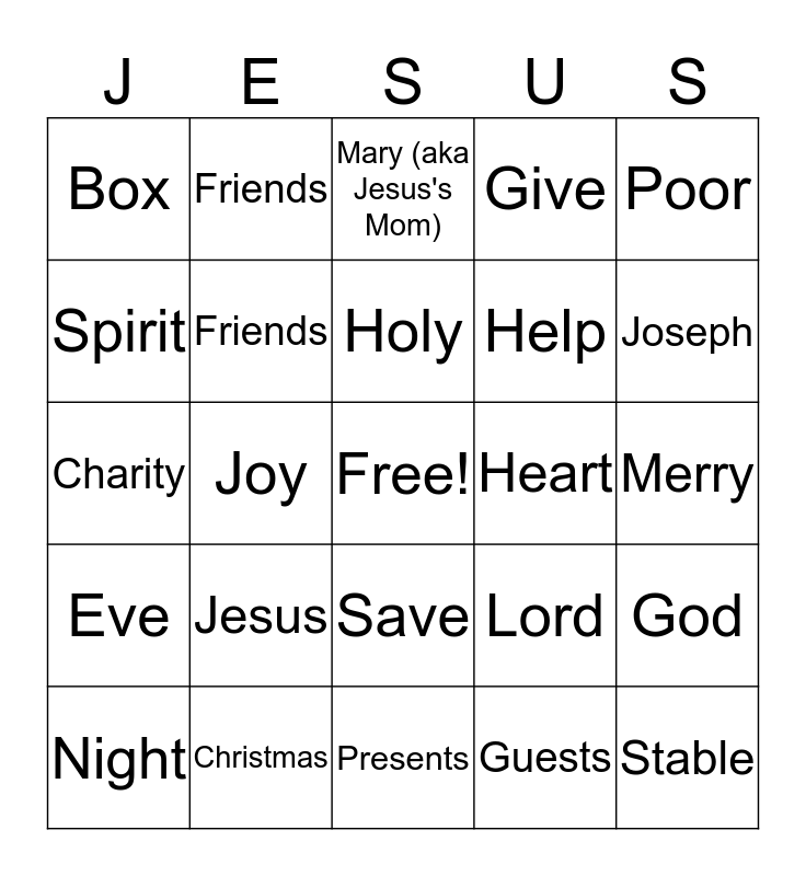 This bingo card has a free space and 24 words: Jesus, Christmas, Holy, Night, Poor, Box, Spirit, Friends, Heart, Save, Help, Charity, Lord, God, Friends, Guests, Merry, Mary (aka Jesus's Mom), Joseph, Joy, Stable, Eve, Give and Presents.