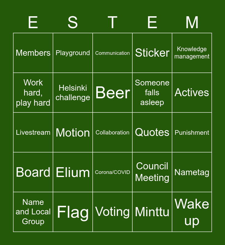 This bingo card has 36 words: ESTIEM Structure, Goal, ESTIEM Spirit, Helsinki challenge, Council Meeting, Board, Beer, Energizer, Knowledge management, Feedback, Motion, Sticker, Aim high, Quotes, Actives, Members, Wake up, Elium, Collaboration, Communication, Punishment, Nametag, Flag, Name and Local Group, Voting, Playground, Livestream, Someone has to do a buffalo, Someone falls asleep, Work hard, play hard, GDPR, Potato game is played, Minttu, Corona/COVID, Connection issues/bad connection and Haka.