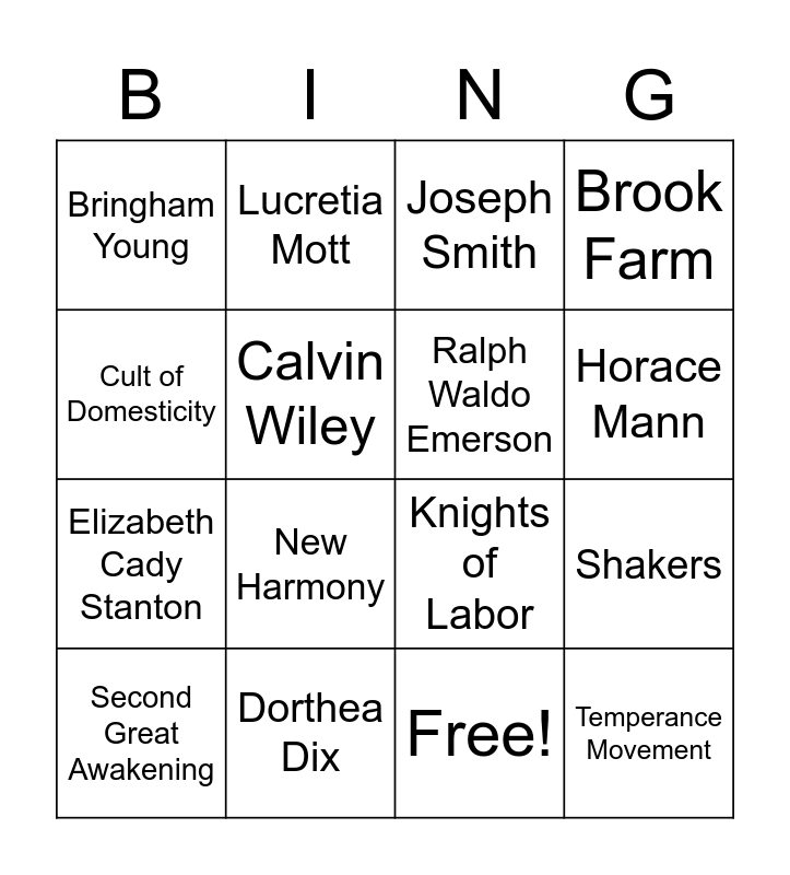 This bingo card has 17 words: Free!, Second Great Awakening, Joseph Smith, Bringham Young, New Harmony, Brook Farm, Shakers, Ralph Waldo Emerson, Horace Mann, Calvin Wiley, Dorthea Dix, Knights of Labor, Cult of Domesticity, Lucretia Mott, Elizabeth Cady Stanton, Seneca Falls and Temperance Movement.