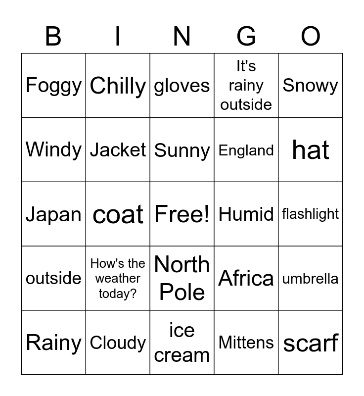 This bingo card has a free space and 24 words: How's the weather today?, Cloudy, Sunny, Rainy, Snowy, Foggy, Windy, Chilly, Humid, North Pole, England, Japan, Africa, umbrella, Jacket, Mittens, flashlight, gloves, hat, coat, scarf, outside, It's rainy outside and ice cream.