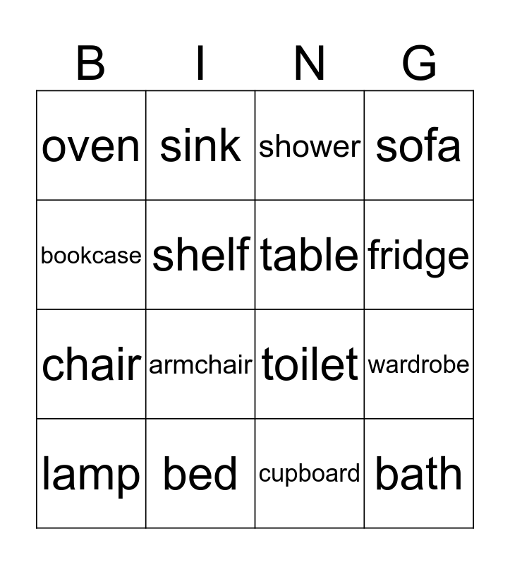 This bingo card has 16 words: bed, wardrobe, shower, oven, chair, sink, toilet, cupboard, bookcase, shelf, lamp, sofa, armchair, fridge, table and bath.