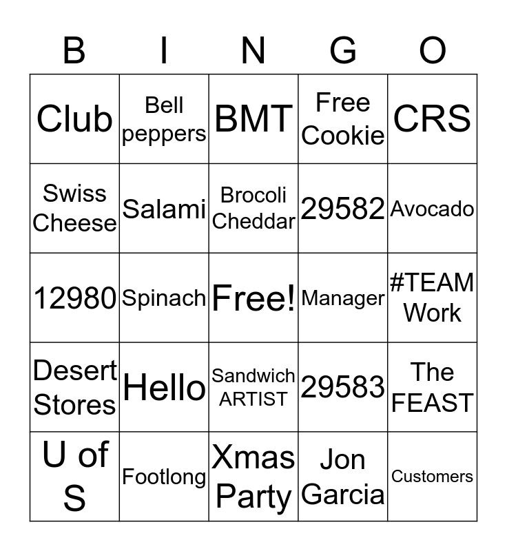 This bingo card has a free space and 24 words: Hello, Footlong, Brocoli Cheddar, U of S, CRS, Club, Swiss Cheese, Bell peppers, Manager, Sandwich ARTIST, 29582, 12980, 29583, The FEAST, Salami, Jon Garcia, #TEAM Work, BMT, Avocado, Spinach, Customers, Desert Stores, Free Cookie and Xmas Party.