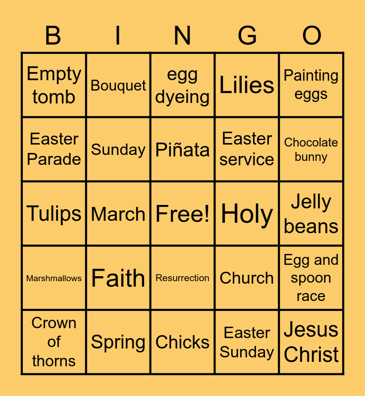 This bingo card has a free space and 40 words: April, Tulips, Three days, Sunday, Spring, Resurrection, Piñata, Paper Mache, Painting eggs, Marshmallows, March, Lilies, Jesus Christ, Jelly beans, Holy, Faith, Eternal life, Empty tomb, Egg toss, egg dyeing, Egg and spoon race, Easter Sunday, Easter service, Easter Parade, Easter eggs, Easter egg hunt, Easter Bunny, Easter basket, Decorations, Daffodils, Crucifixion, Crown of thorns, Cross, Church, Chocolate bunny, Chicks, Cards, Candy, Bouquet and Bonnet.