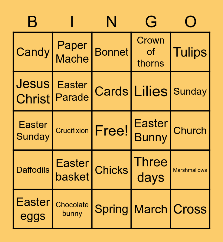 This bingo card has a free space and 40 words: Egg and spoon race, Easter Sunday, Easter service, Easter Parade, Chocolate bunny, Chicks, Cards, April, Tulips, Daffodils, Crucifixion, Crown of thorns, Cross, Church, Easter Bunny, Easter basket, Decorations, Candy, Bouquet, Bonnet, Marshmallows, March, Lilies, Jesus Christ, Jelly beans, Holy, Faith, Eternal life, Empty tomb, Egg toss, egg dyeing, Easter eggs, Easter egg hunt, Three days, Sunday, Spring, Resurrection, Piñata, Paper Mache and Painting eggs.