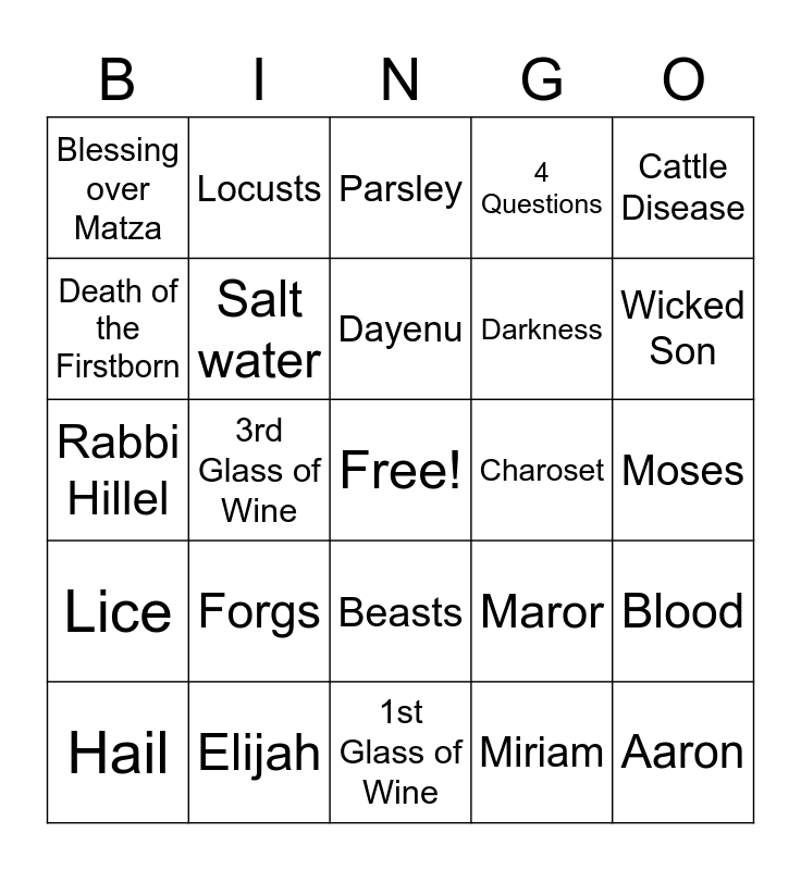 This bingo card has a free space and 31 words: 1st Glass of Wine, 2nd Glass of Wine, 3rd Glass of Wine, 4th Glass of Wine, Blessing over Matza, Parsley, Salt water, Maror, Charoset, Miriam, Moses, Aaron, Wise Son, Simple Son, Wicked Son, Ritual Hand Washing, Blood, Forgs, Lice, Beasts, Cattle Disease, Boils, Hail, Locusts, Darkness, Death of the Firstborn, 4 Questions, Rabbi Hillel, Elijah, Dayenu and Had Gadya.