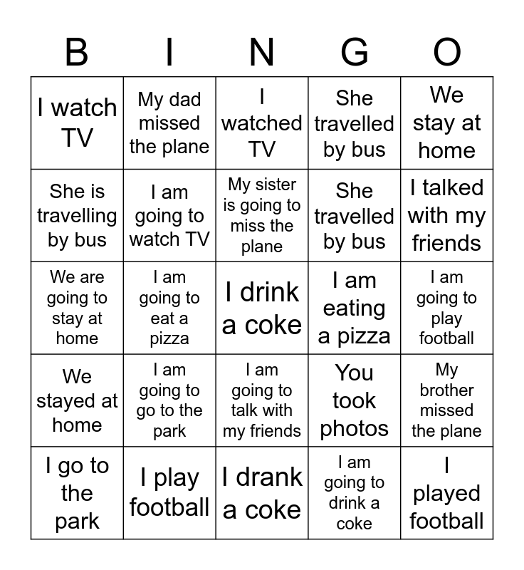 This bingo card has a free space and 29 words: I go to the park, I went to the park, I am going to eat a pizza, I ate a pizza, I watch TV, I watched TV, I am going to watch TV, I am going to go to the park, I am eating a pizza, I play football, I am going to play football, I played football, I drank a coke, I am going to drink a coke, I talked with my friends, I talk with my friends, I am going to talk with my friends, We stayed at home, We stay at home, We are going to stay at home, You took photos, You are going to take photos, She travelled by bus, She is travelling by bus, She travelled by bus, My dad missed the plane, My brother missed the plane, My sister is going to miss the plane and I love chocolate.