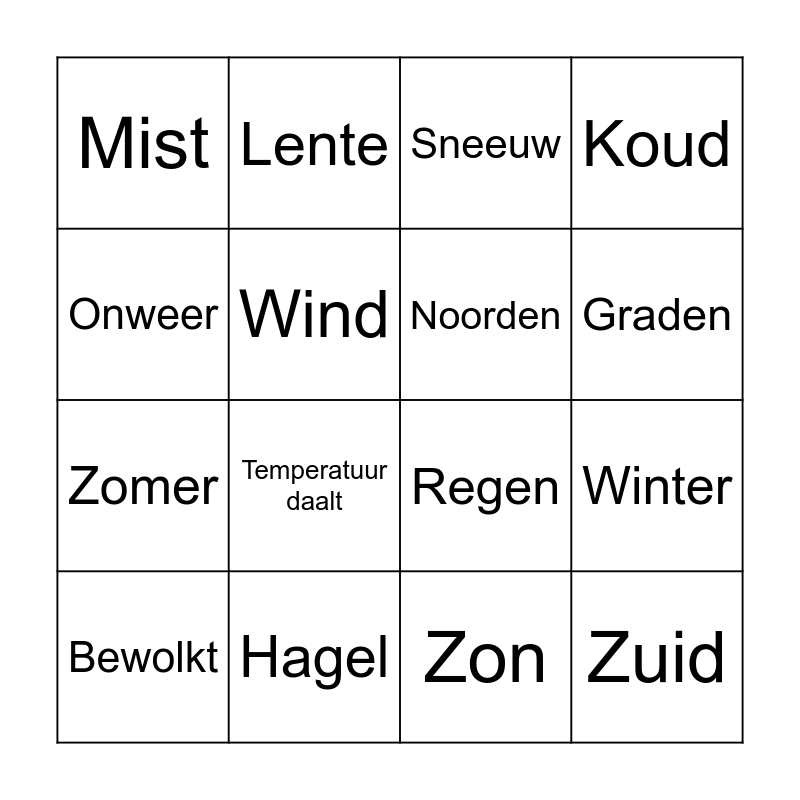 This bingo card has 17 words: Zon, Bewolkt, Sneeuw, Mist, Temperatuur daalt, Koud, Winter, Noorden, Graden, Wind, Hagel, Regen, Onweer, Lente, Zomer, Herfst and Zuid.