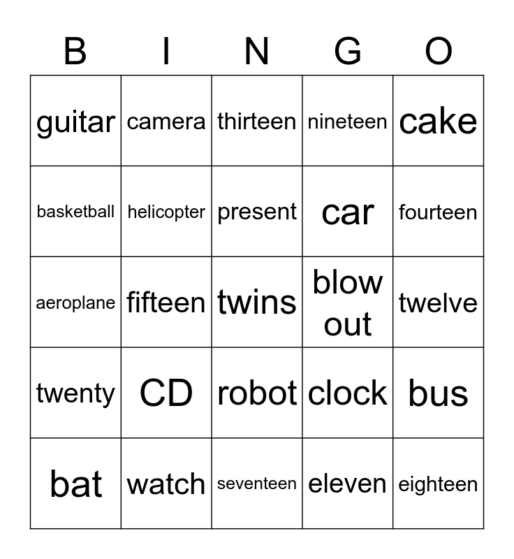 This bingo card has a free space and 24 words: CD, watch, present, bat, cake, guitar, basketball, camera, blow out, robot, car, aeroplane, clock, bus, helicopter, eleven, twelve, thirteen, fourteen, fifteen, eighteen, twenty, nineteen and seventeen.