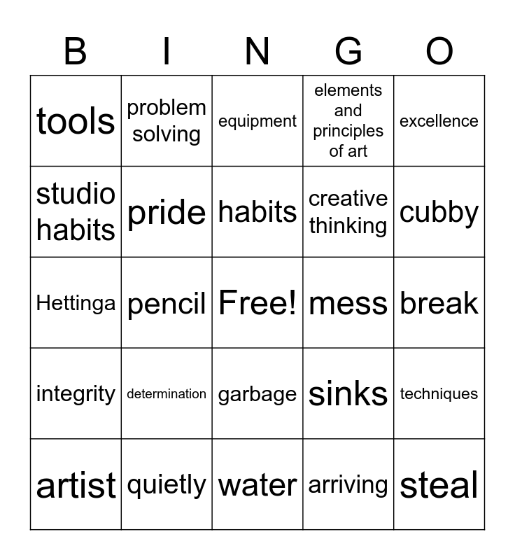 This bingo card has a free space and 30 words: quietly, bellringer, pencil, respect, tools, equipment, pride, garbage, mess, water, break, steal, arriving, during, cubby, counters, sinks, integrity, determination, excellence, Hettinga, dmms, problem solving, creative thinking, studio habits, elements and principles of art, techniques, artist, habits and skills.