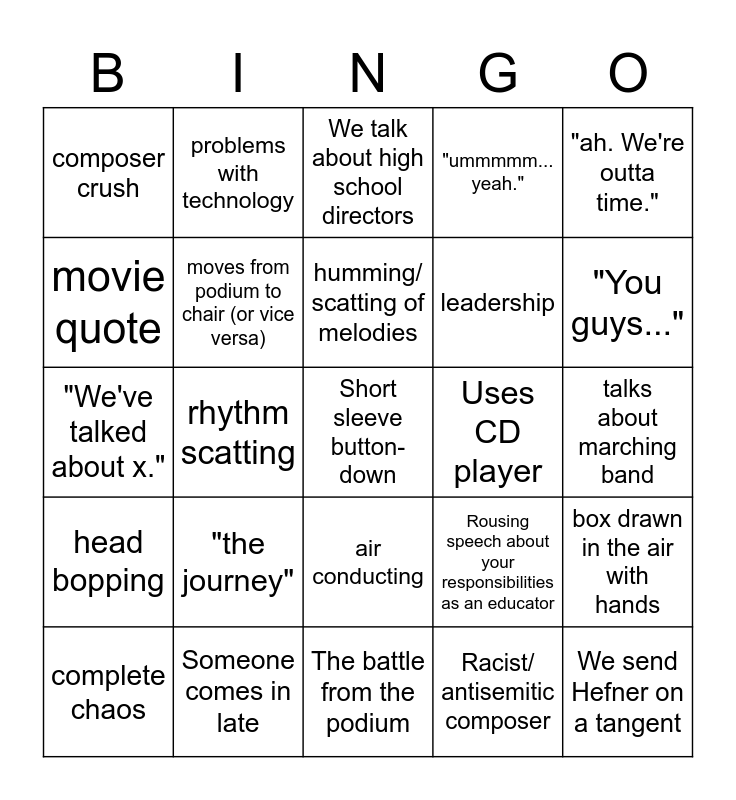This bingo card has a free space and 65 words: goofballs, podium lean, Visual/aural/ kinesthetic learner, box drawn in the air with hands, drum noises, "I mean...", problems with technology, "Whatever helps you!", humming/ scatting of melodies, jazz fingers, air conducting, movie reference, talks about marching band, "ah. We're outta time.", "ya know...", movie quote, rhythm scatting, composer crush, 'the game' is mentioned, leadership, "the journey", head bopping, "ummmmm... yeah.", "What's that", rousing speech about music, thumb wrestles with himself, Maddie eats breakfast, Ande eats breakfast, We send Hefner on a tangent, "so... anyway", complete chaos, chair lean, "have I told you this story?", old kentucky story, Rousing speech about your responsibilities as an educator, Someone comes in late, music his daughter listened to that morning, "We've talked about x.", Racist/ antisemitic composer, "shhh shhhh shhh shh", moves from podium to chair (or vice versa), "Let's listen to this", Uses CD player, "What were your thoughts on this chapter?", Licks finger to turn page, Emotions are mentioned, "You guys...", "At other institutions", What we do at LVC, Florida story, "That's on me", says one of our answers are "good, good", Grace plays with her hair, The battle from the podium, Maddie hand raise (tm), Check in/check out exercise, "How to connect with your ensemble...", We talk about high school directors, Style over note attainment, Santoro hand snap thing, "Good answer", "I apologize", Snapping, Morgan makes faces and Dr. Carmichael is mentioned.
