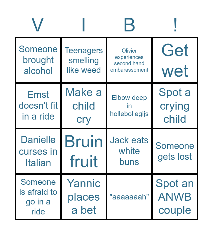 This bingo card has 24 words: Find a crack in a steel structure, Floris eats 10 poffertjes in 20 seconds, Spot a crying child, Yannic breaks something, Ernst doesn’t fit in a ride, Someone brought alcohol, Make a child cry, Teenagers smelling like weed, Yannic places a bet, It rains, Danielle curses in Italian, Jack eats white buns, Eat sambal vesuvio during a ride, Make an Efteling employee laugh, Elbow deep in hollebollegijs, Tickle Ihor, "aaaaaaah", Olivier experiences second hand embarassement, Bruin fruit, Someone gets lost, Someone is afraid to go in a ride, Spot an ANWB couple, Get wet and Churros.