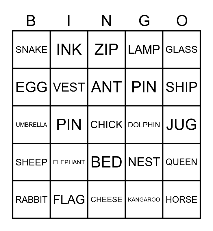 This bingo card has 26 words: BED, KANGAROO, ANT, FLAG, GLASS, SNAKE, EGG, INK, JUG, NEST, PIN, UMBRELLA, QUEEN, RABBIT, PIN, YACHT, LAMP, SHEEP, ZIP, CHICK, SHIP, CHEESE, DOLPHIN, ELEPHANT, VEST and HORSE.