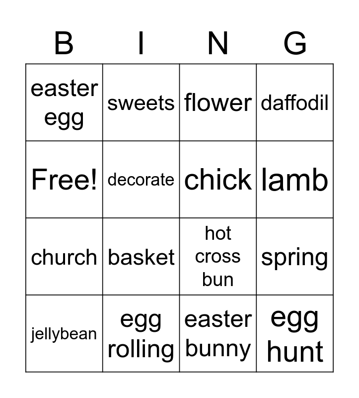 This bingo card has 16 words: egg rolling, spring, flower, easter egg, church, sweets, hot cross bun, easter bunny, Free!, decorate, jellybean, daffodil, basket, lamb, chick and egg hunt.