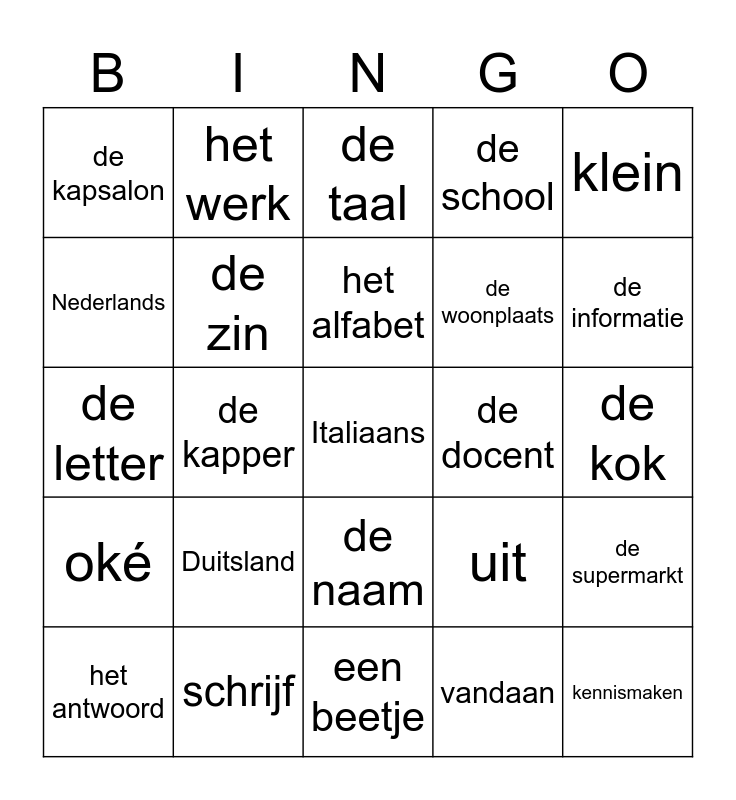 This bingo card has 25 words: Duitsland, een beetje, het alfabet, het antwoord, klein, de kapsalon, Nederlands, het werk, de docent, de naam, de woonplaats, de letter, uit, de supermarkt, de zin, kennismaken, de kok, de taal, de informatie, de kapper, Italiaans, schrijf, oké, de school and vandaan.