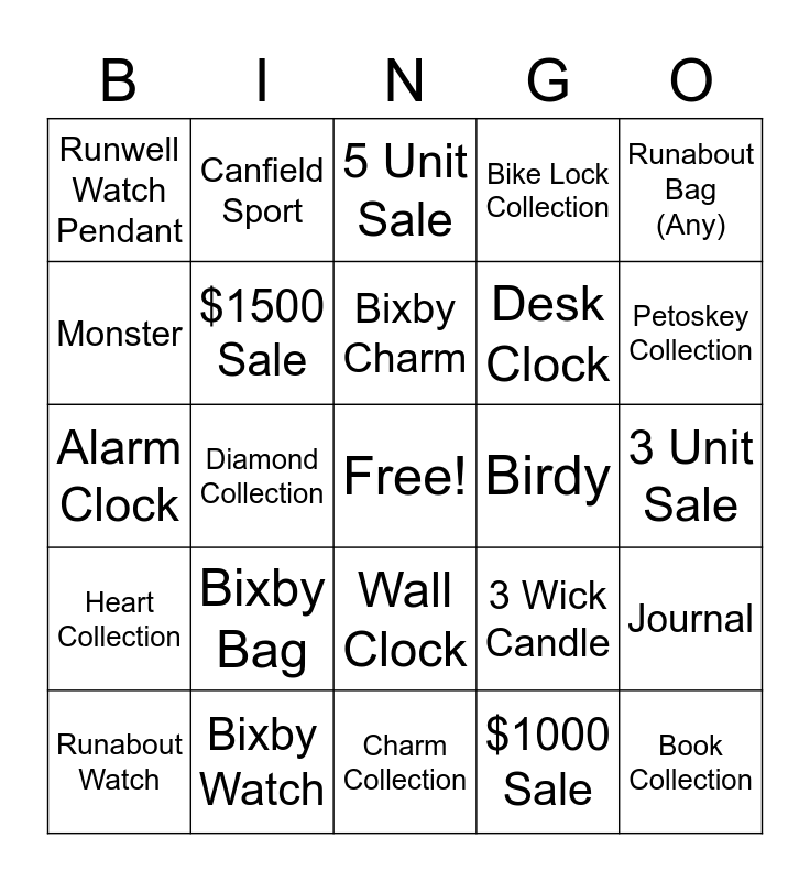 This bingo card has a free space and 24 words: Bixby Bag, Bixby Watch, Bixby Charm, Runabout Watch, Runabout Bag (Any), Runwell Watch Pendant, Monster, Canfield Sport, Birdy, Wall Clock, Desk Clock, Alarm Clock, 3 Wick Candle, Journal, $1500 Sale, $1000 Sale, 3 Unit Sale, 5 Unit Sale, Petoskey Collection, Diamond Collection, Book Collection, Heart Collection, Bike Lock Collection and Charm Collection.