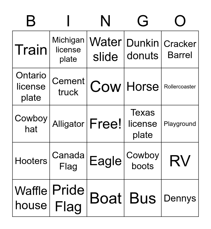 This bingo card has a free space and 24 words: Canada Flag, Pride Flag, Cow, Waffle house, Cracker Barrel, Train, Ontario license plate, Michigan license plate, Texas license plate, Eagle, Horse, Cowboy hat, Cowboy boots, RV, Cement truck, Bus, Playground, Water slide, Rollercoaster, Alligator, Dennys, Hooters, Dunkin donuts and Boat.