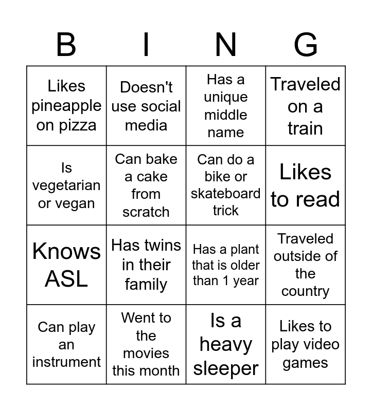 This bingo card has 51 words: Likes house chores, Can play an instrument, Loves reality shows, Has a pet that is not a dog or cat, Can speak two languages, Likes to garden, Doesn't use social media, Hates snakes, Can bake a cake from scratch, Enjoys camping, Can do a bike or skateboard trick, Traveled on a train, Attended a concert this year or last year, Has lived in more than one state, Been an extra in a movie, Played a sport in high school, Likes to read, Went to the movies this month, Has an unusual family tradition, Is vegetarian or vegan, Traveled outside of the country, Been skydiving, Likes pineapple on pizza, Knows ASL, Can dance, Knows a magic trick, Has twins in their family, Met a celebrity, Has sang karaoke, Has a unique middle name, Has more than 3 siblings, Ran a marathon, Been to a comedy show, Is a night owl, Is a parent, Drinks 3+ cups of coffee a day, Broken a bone, Has caught a fish in the wild, Has made pasta from scratch, Is related to someone famous, Is a heavy sleeper, Likes to play video games, Is a dare devil, Has been in a talent show, Has been in a haunted house, Is named after someone, Has a plant that is older than 1 year, Cooked dinner last night, Has gone scuba diving, Is a social media influencer and Is subscribed to YouTube Channels.