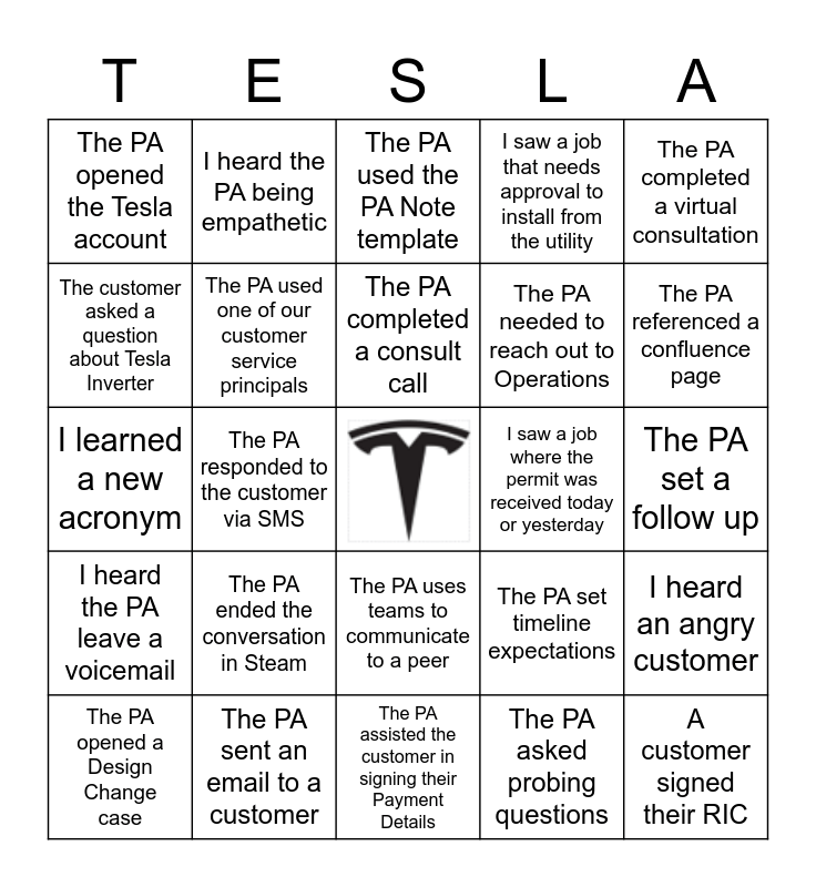 This bingo card has a free space and 24 words: The PA ended the conversation in Steam, The PA sent an email to a customer, The PA completed a consult call, The PA opened a Design Change case, The PA completed a virtual consultation, The PA opened the Tesla account, The customer asked a question about Tesla Inverter, I heard the PA being empathetic, I saw a job where the permit was received today or yesterday, The PA uses teams to communicate to a peer, The PA needed to reach out to Operations, I learned a new acronym, The PA set timeline expectations, I heard an angry customer, The PA used one of our customer service principals, The PA asked probing questions, The PA set a follow up, The PA used the PA Note template, The PA referenced a confluence page, The PA responded to the customer via SMS, A customer signed their RIC, I heard the PA leave a voicemail, I saw a job that needs approval to install from the utility and The PA assisted the customer in signing their Payment Details.