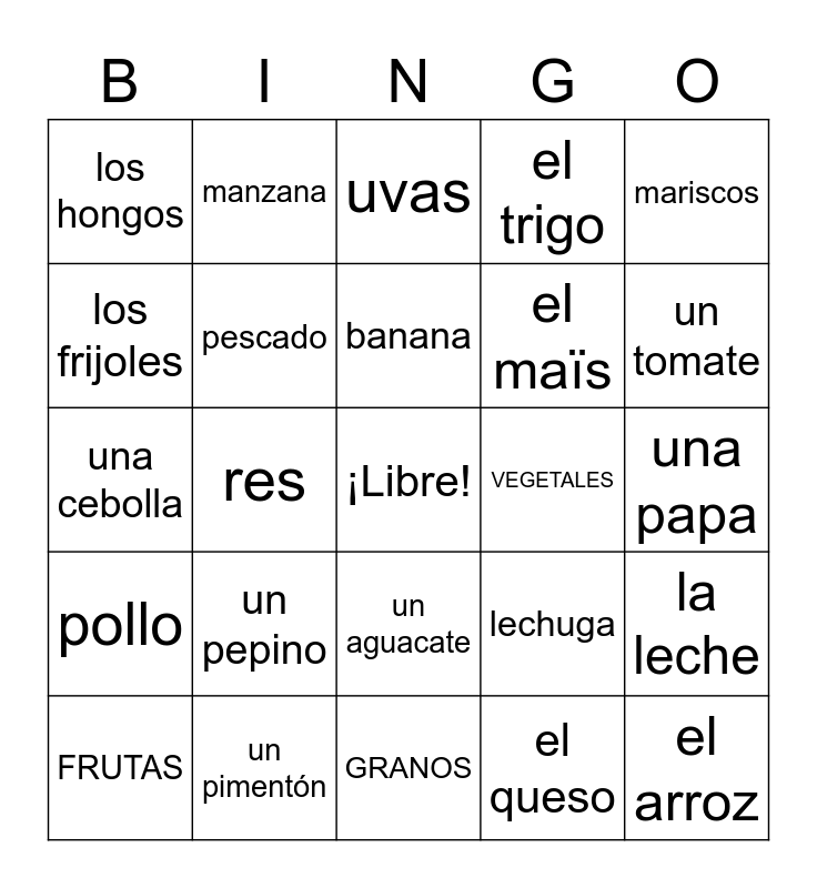 This bingo card has a free space and 33 words: CARNES, cerdo, res, camarón, pollo, pescado, mariscos, FRUTAS, manzana, pera, banana, uvas, limone, naranja, VEGETALES, un tomate, un pimentón, una cebolla, un pepino, lechuga, un aguacate, una zanahoria, los hongos, una papa, GRANOS, el arroz, el trigo, el maïs, los frijoles, la leche, los huevos, el queso and la mantequilla.