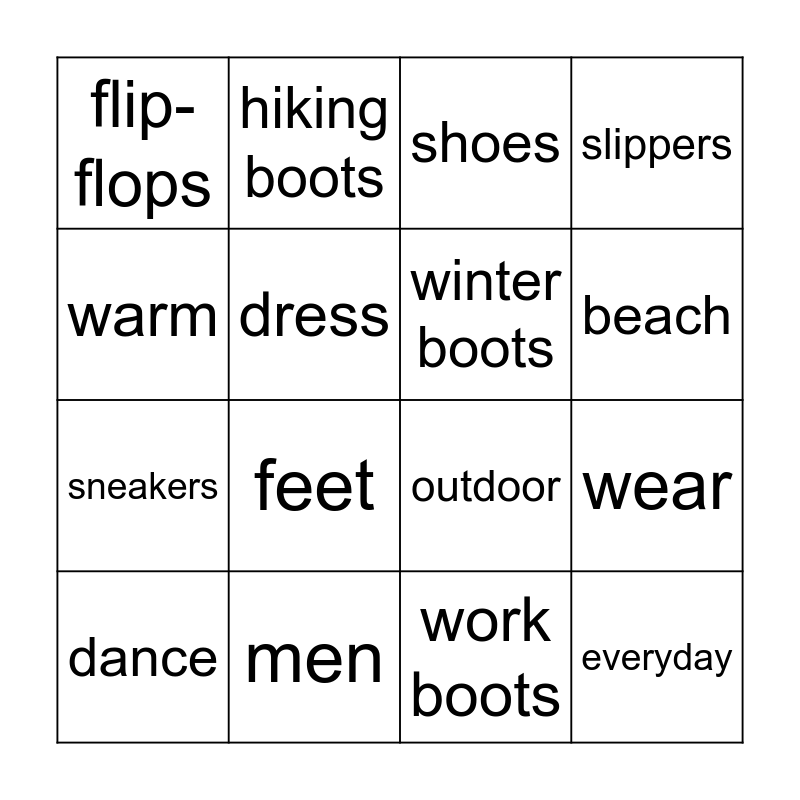 This bingo card has 16 words: men, wear, shoes, flip- flops, sneakers, hiking boots, outdoor, work boots, warm, dress, dance, slippers, feet, beach, winter boots and everyday.