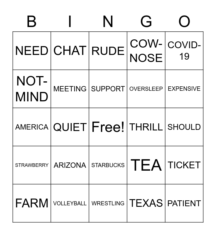 This bingo card has a free space and 29 words: FARM, CHAMP, QUIET, ODD, NEED, RUDE, MEETING, ARIZONA, THRILL, VOLLEYBALL, SHOULD, PATIENT, WRESTLING, TEXAS, EXPENSIVE, MOUNTAIN, STARBUCKS, STRAWBERRY, COVID-19, AMERICA, TEA, TEND-TO, OVERSLEEP, NOT-MIND, COW-NOSE, CHAT, TICKET, SUPPORT and COACH.