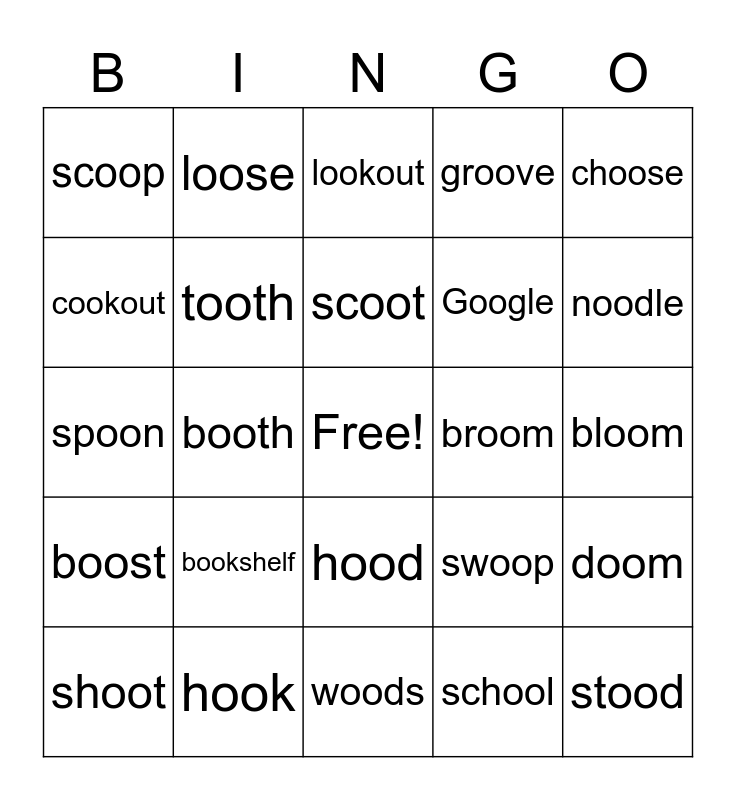 This bingo card has a free space and 29 words: shoot, footprint, booth, seafood, scoop, lookout, tooth, bookshelf, broom, hook, bloom, stood, woods, school, noodle, ooze, hood, boost, choose, spoon, swoop, shook, Google, cookout, groove, loose, doom, scoot and football.