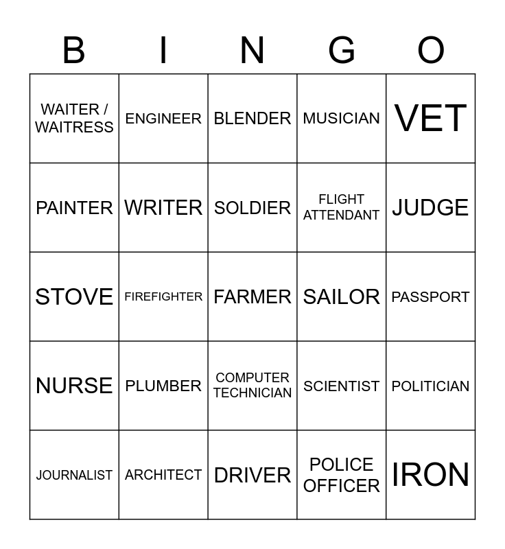 This bingo card has 48 words: Free!, FARMER, BAKER, DRIVER, PLUMBER, ELECTRICIAN, ENGINEER, COOK, PAINTER, ARTIST, WRITER, MUSICIAN, POLITICIAN, SCIENTIST, INVENTOR, MILITARY, SOLDIER, SAILOR, BUTCHER, VET, FIREFIGHTER, POLICE OFFICER, WAITER / WAITRESS, FLIGHT ATTENDANT, LAWYER, JUDGE, JOURNALIST, TOUR GUIDE, COMPUTER TECHNICIAN, NURSE, ESTATE AGENT, SECRETARY, RECEPTIONIST, HAIRDRESSER, ARCHITECT, ACCOUNTANT, PUBLIC SERVANT, PASSPORT, TO GO ABROAD, HOW MUCH IS IT?, FIREPLACE, IRON, BLENDER, MICROWAVE, STOVE, OUT OF ORDER, HEADACHE and FEVER.