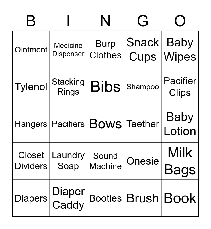 This bingo card has 25 words: Laundry Soap, Booties, Bibs, Diapers, Baby Wipes, Ointment, Tylenol, Medicine Dispenser, Teether, Sound Machine, Shampoo, Hangers, Onesie, Milk Bags, Stacking Rings, Book, Baby Lotion, Burp Clothes, Pacifier Clips, Pacifiers, Bows, Diaper Caddy, Closet Dividers, Snack Cups and Brush.