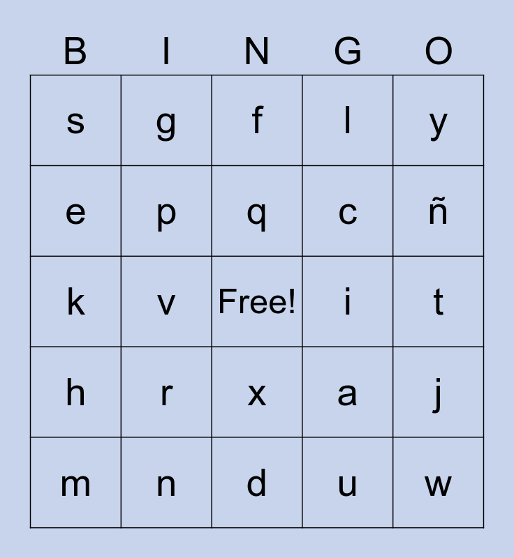 This bingo card has a free space and 27 words: a, b, c, d, e, f, g, h, i, j, k, l, m, n, ñ, o, p, q, r, s, t, u, v, w, x, y and z.