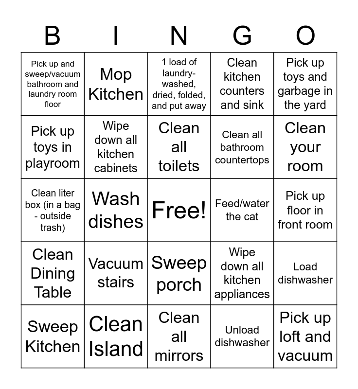 This bingo card has a free space and 24 words: Vacuum stairs, Clean Island, Clean all toilets, Sweep Kitchen, Pick up toys and garbage in the yard, Pick up and sweep/vacuum bathroom and laundry room floor, Pick up toys in playroom, Mop Kitchen, Feed/water the cat, Sweep porch, Clean all bathroom countertops, Clean liter box (in a bag - outside trash), Wipe down all kitchen appliances, Load dishwasher, Wipe down all kitchen cabinets, Unload dishwasher, Pick up floor in front room, 1 load of laundry- washed, dried, folded, and put away, Clean your room, Wash dishes, Pick up loft and vacuum, Clean Dining Table, Clean kitchen counters and sink and Clean all mirrors.